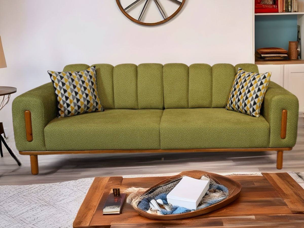 Üç kişilik geniş kanepe, zarif desenli yastıklarıyla hem konforu hem estetiği sunuyor. Ahşap detaylarla zenginleştirilen tasarım, sıcak bir atmosfer yaratıyor.